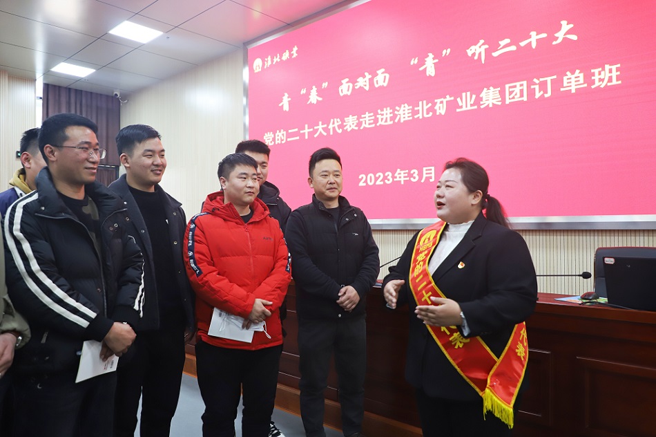 (2023年3月2日,黨的二十大代表劉婉春走進(jìn)淮北礦業(yè)集團(tuán)“訂單班”,面對(duì)面向訂單班學(xué)員宣講黨的二十大精神。)
