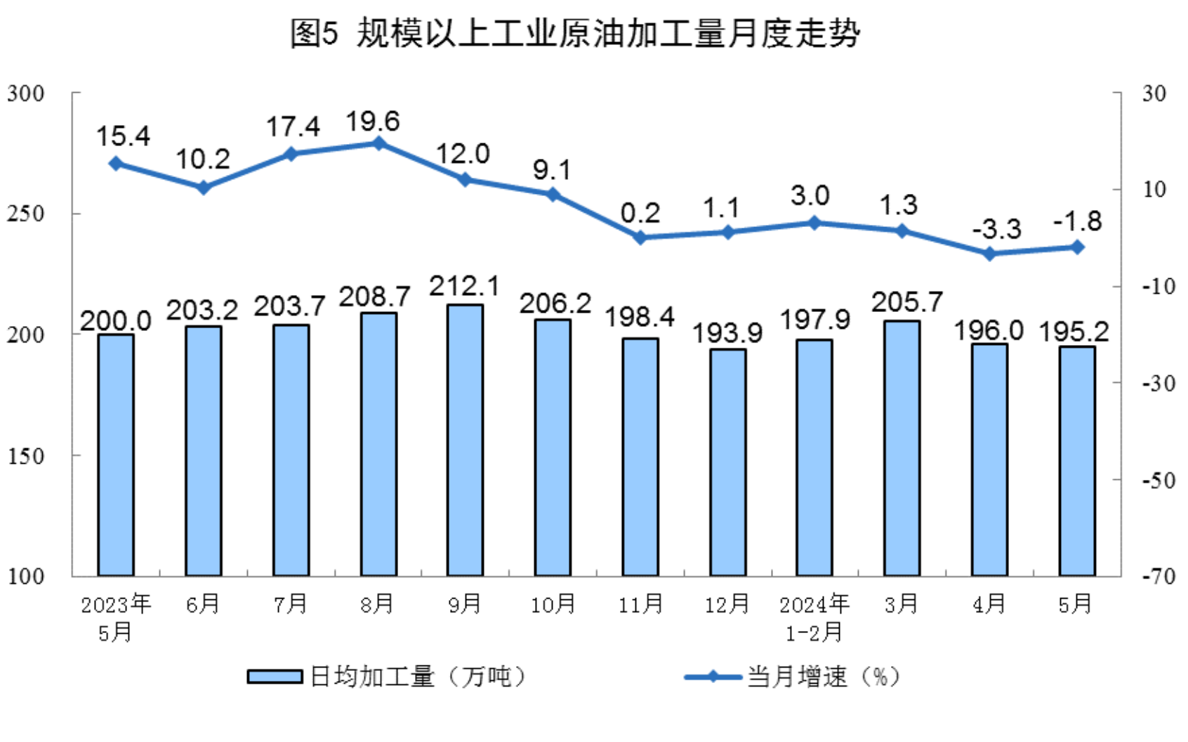 ?原油加工降幅收窄。5月份,規(guī)上工業(yè)原油加工量6052萬噸,同比下降1.8%,降幅比4月份收窄1.5個(gè)百分點(diǎn);日均加工195.2萬噸。1-5月份,規(guī)上工業(yè)原油加工量30177萬噸,同比增長(zhǎng)0.3%。